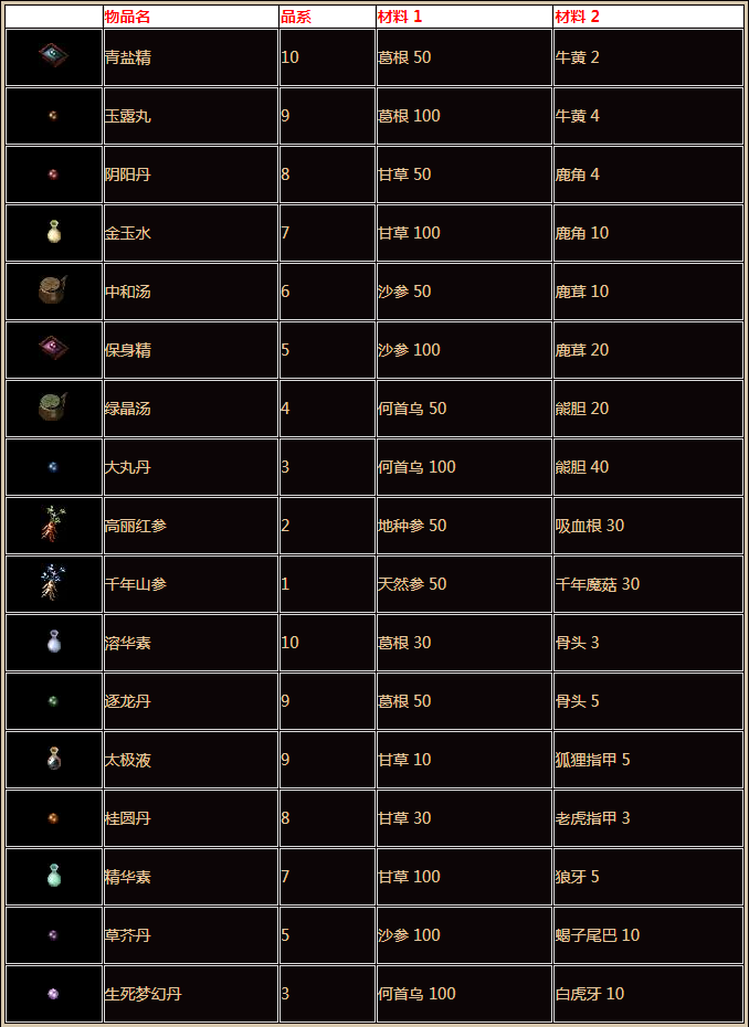 | 女 | 金毛狮甲 2 | 骸骨 2 | 千年纯金 1 | 千年水石 2 |