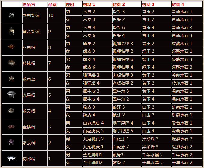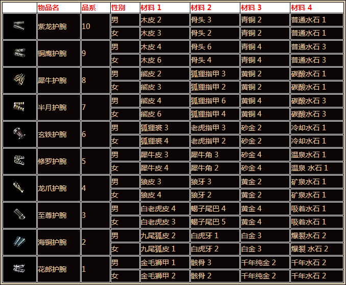 | 百神战甲 | 4 | 男 | 狼皮 3 | 狼牙 3 | 黄金 1 | 矿泉水石 1 | |