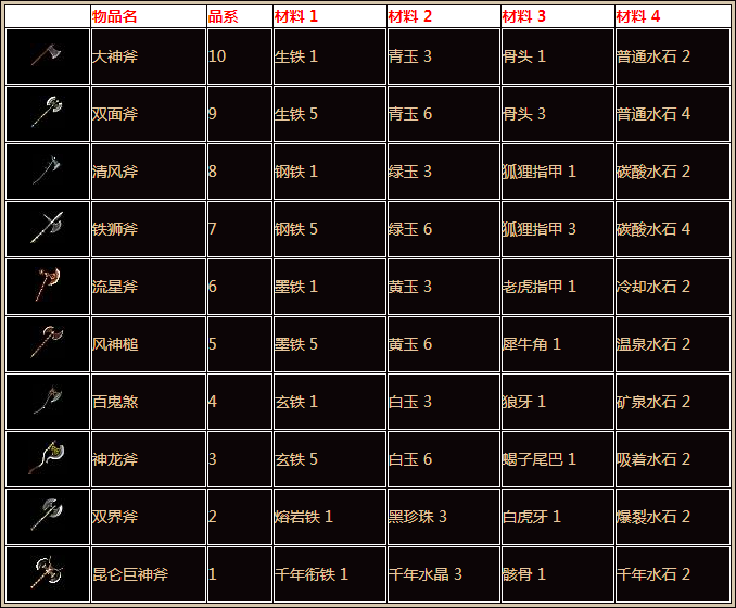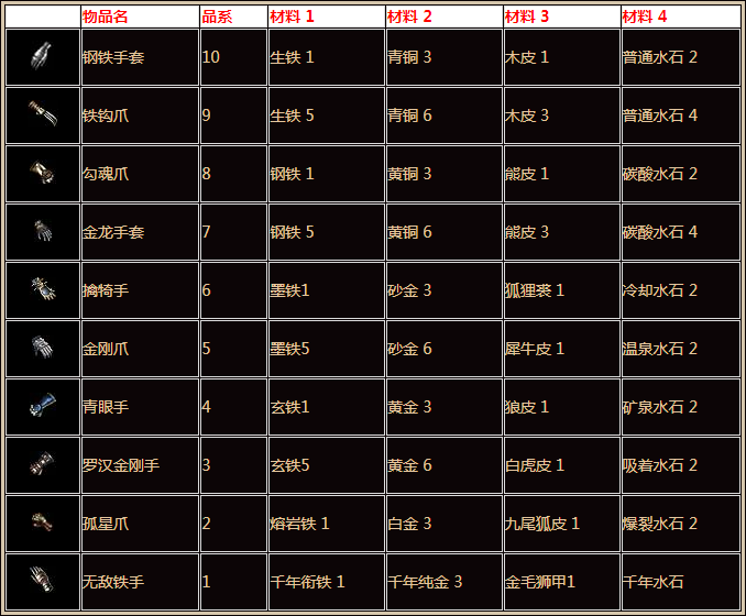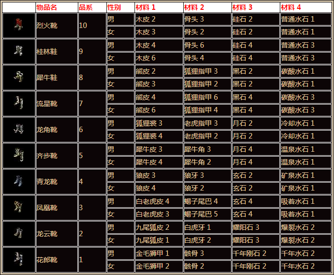 | 火王战甲 | 6 | 男 | 狐狸裘 2 | 老虎指甲 3 | 砂金 1 | 冷却水石 2 | |