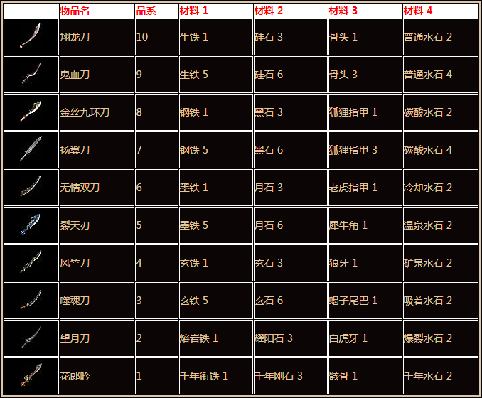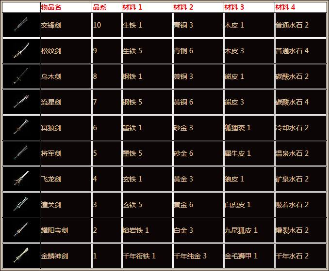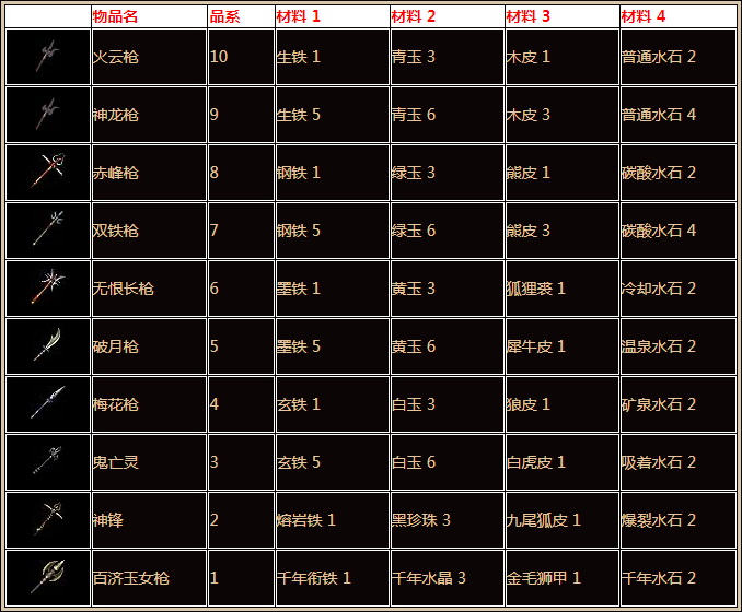 | 霸王战甲 | 5 | 男 | 犀牛皮 2 | 犀牛角 3 | 砂金 2 | 温泉水石 2 | |